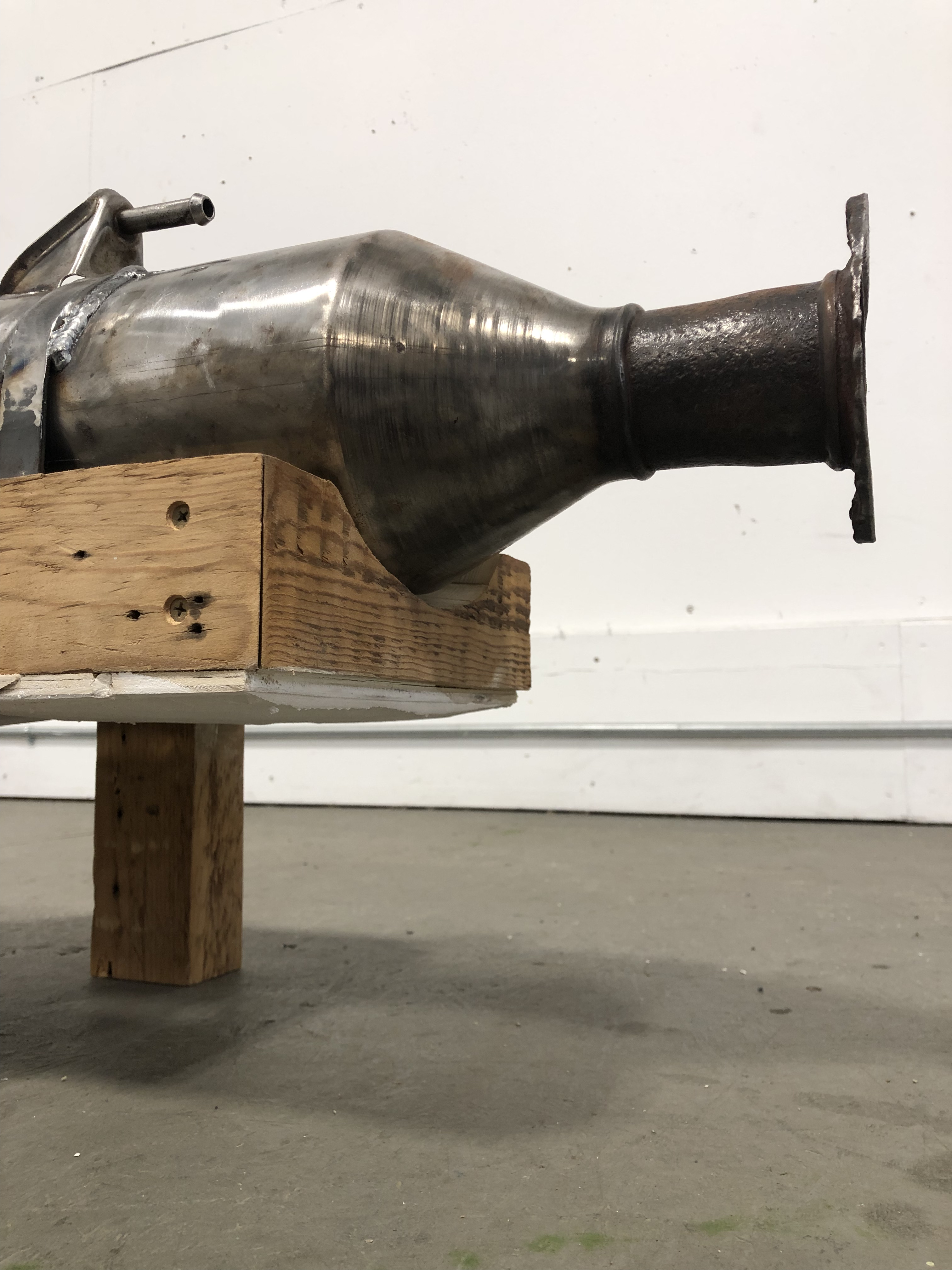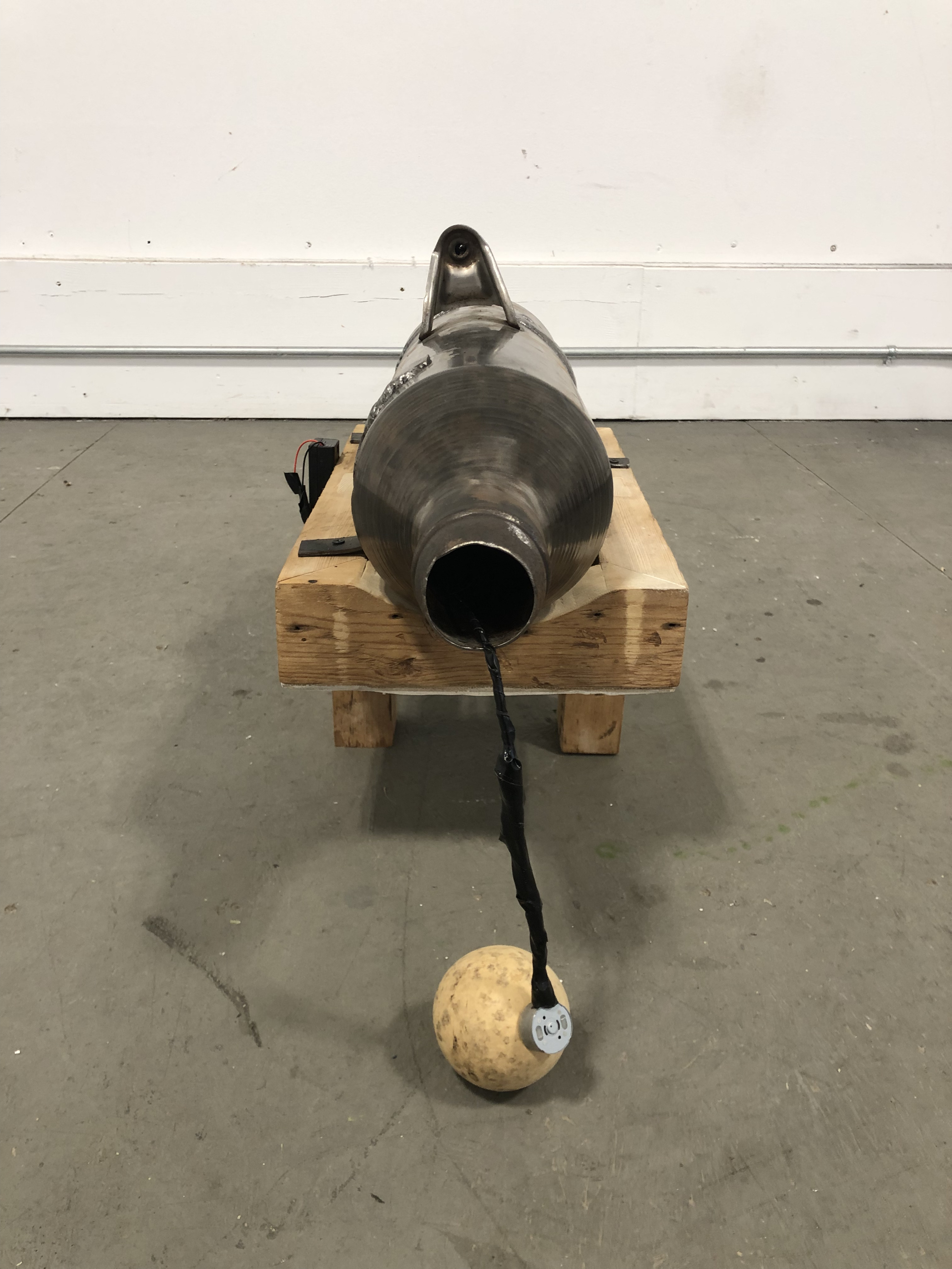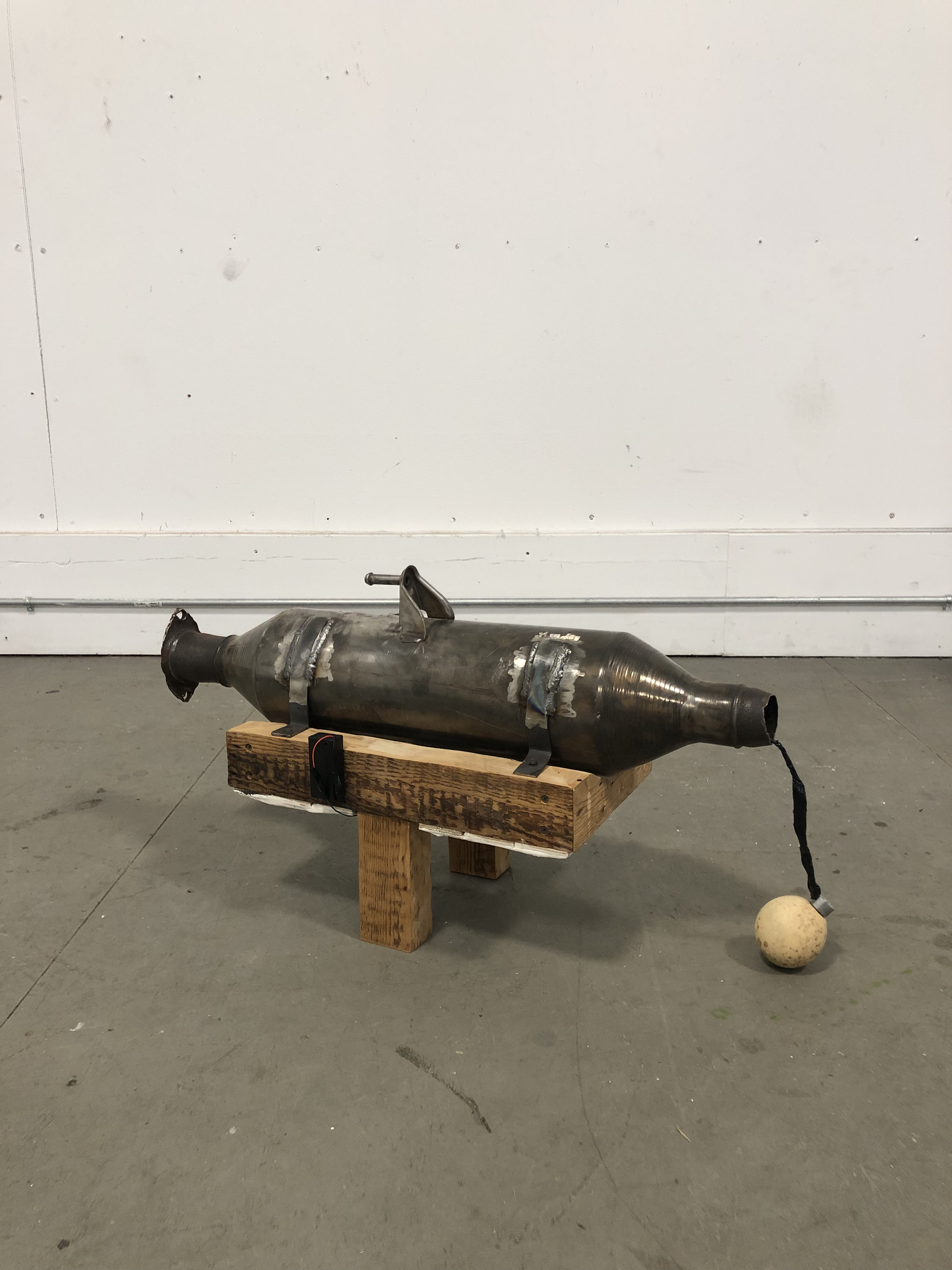 Found wood, found muffler, steel, 12v motor, wires, plaster