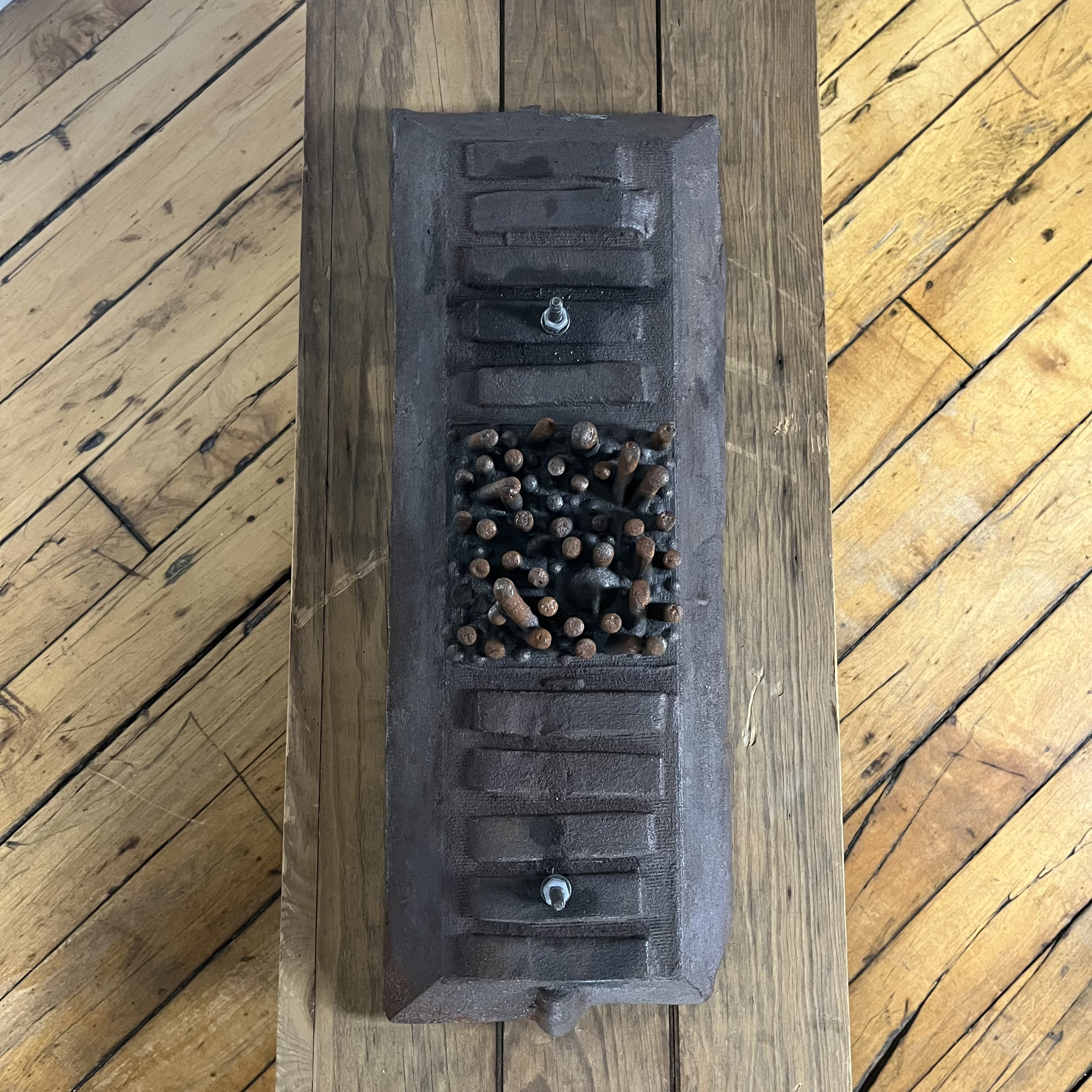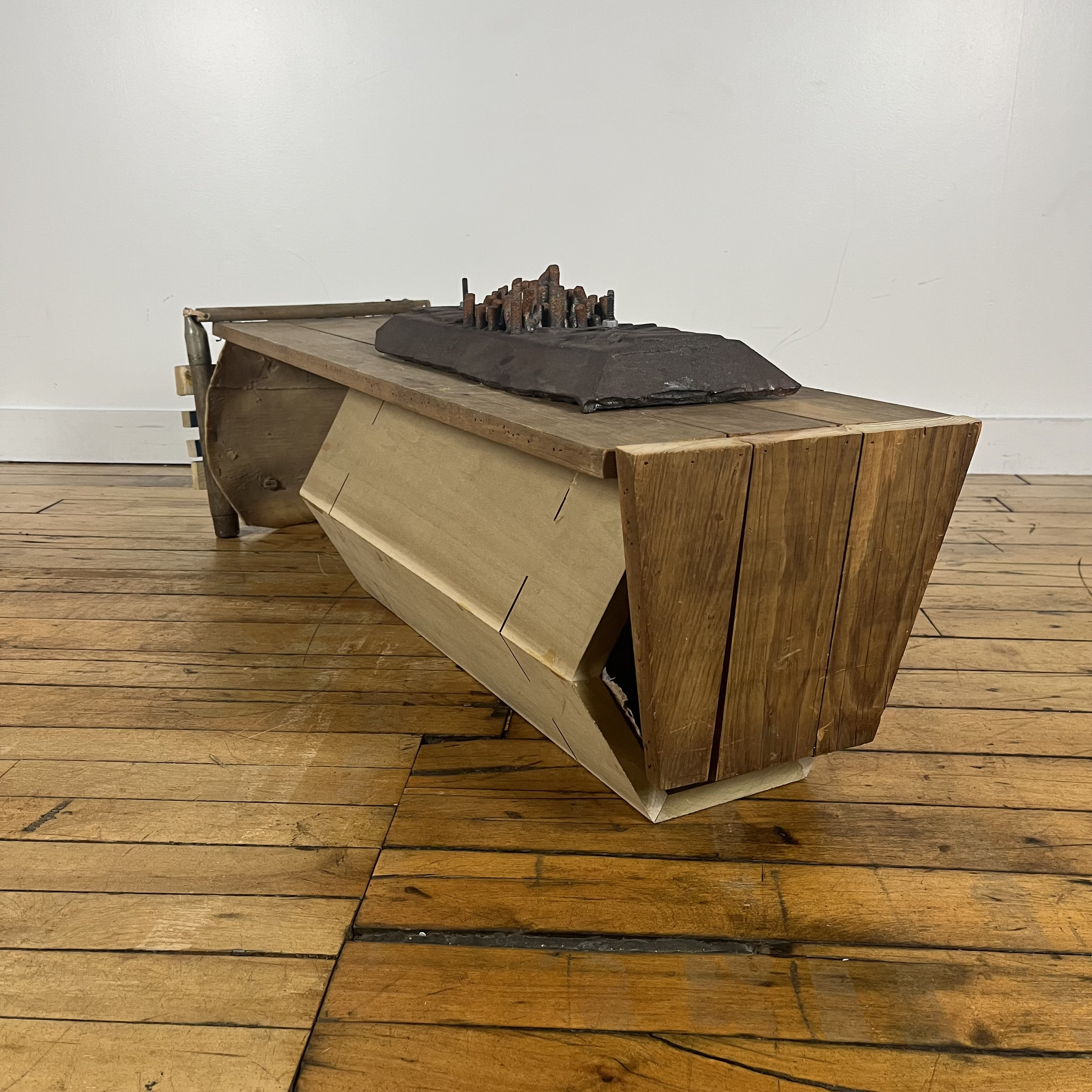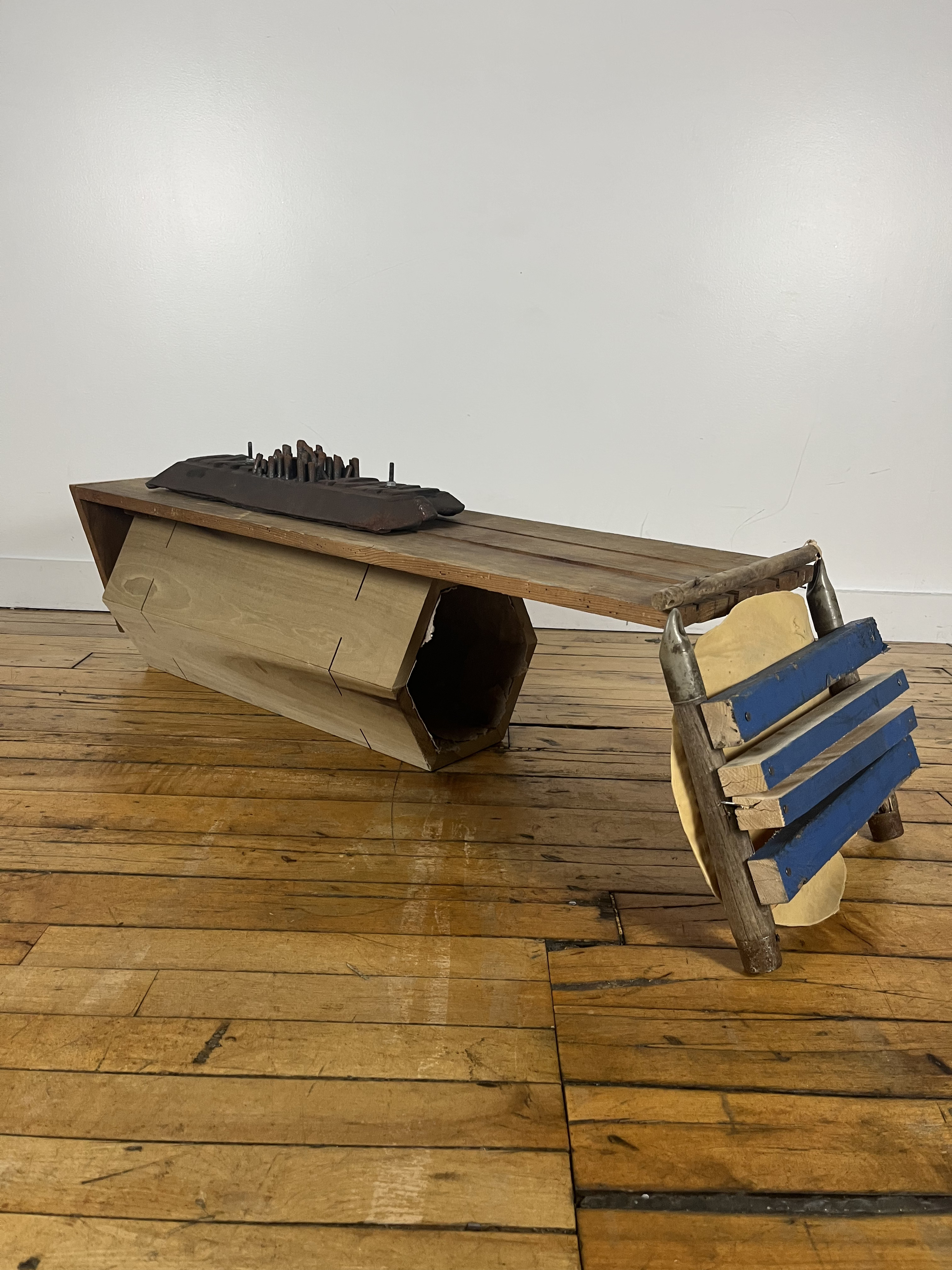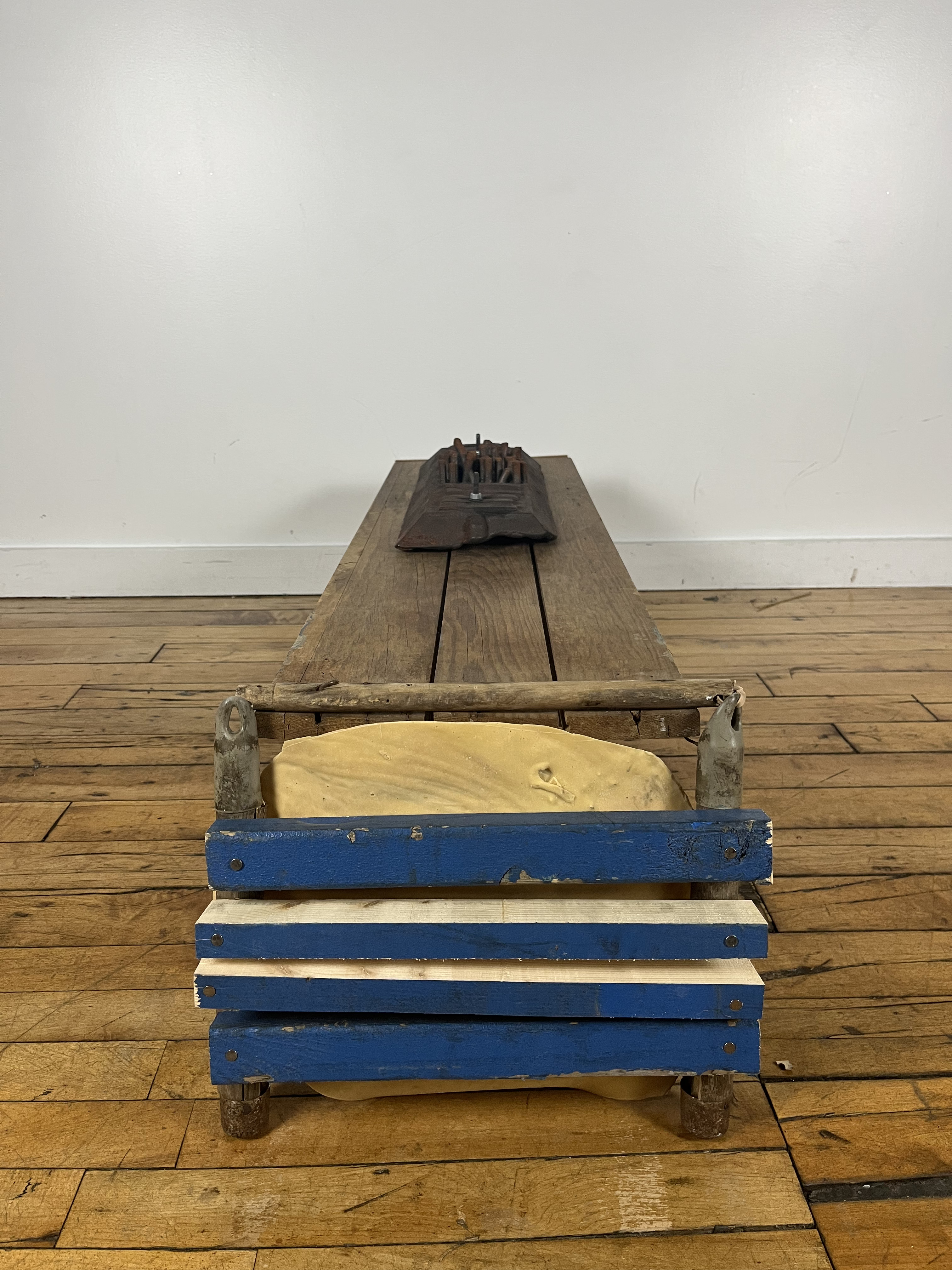 wood, found ironing board, cast iron, paper pulp, latex, garden shear handles, found police blockade, rubber band, 9mm bullet casings
